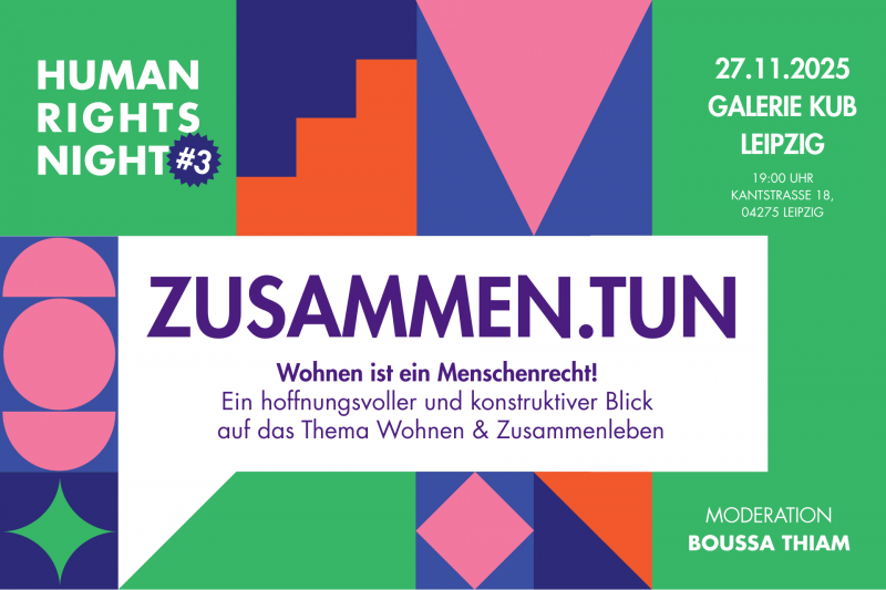 Am 27. November 2025 lädt die Menschenrechtsinitiative “Frei und Gleich" zur dritten Ausgabe der Human Rights Night in die Galerie KUB, Leipzigein. Unter dem Motto ZUSAMMEN.TUN steht in diesem Jahr das Thema Wohnen & Zusammenleben im Mittelpunkt – ein Menschenrecht, das in Zeiten wachsender sozialer Spannungen und Herausforderungen aktueller denn je ist.