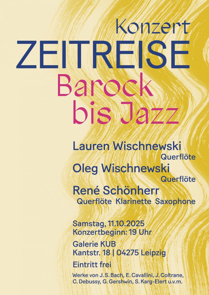 Ist es möglich, eine musikalische Reise von der Barockzeit bis zum Jazz mit Hilfe von drei Querflöten anzutreten? Eine faszinierende Konstellation, die seinesgleichen sucht. Ein Vergnügen, denn vom Herbst bis zum Frühling ist zweifellos der Winter die Jahreszeit, die uns dazu verleitet, vom Sommer zu träumen. HERBST Konzerte in der galerie KUB. mit den Künstlern: Lauren Wischnewski Querflöte, Oleg Wischnewski Querflöte René Schönherr Querflöte, Klarinette, Saxophone